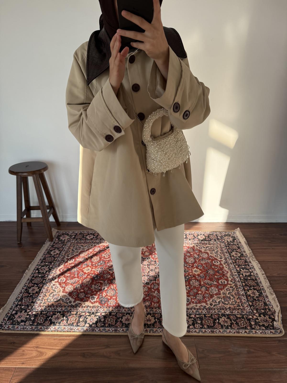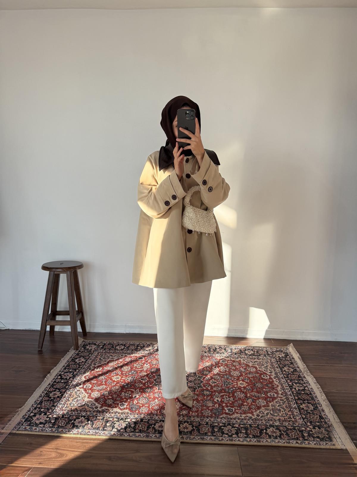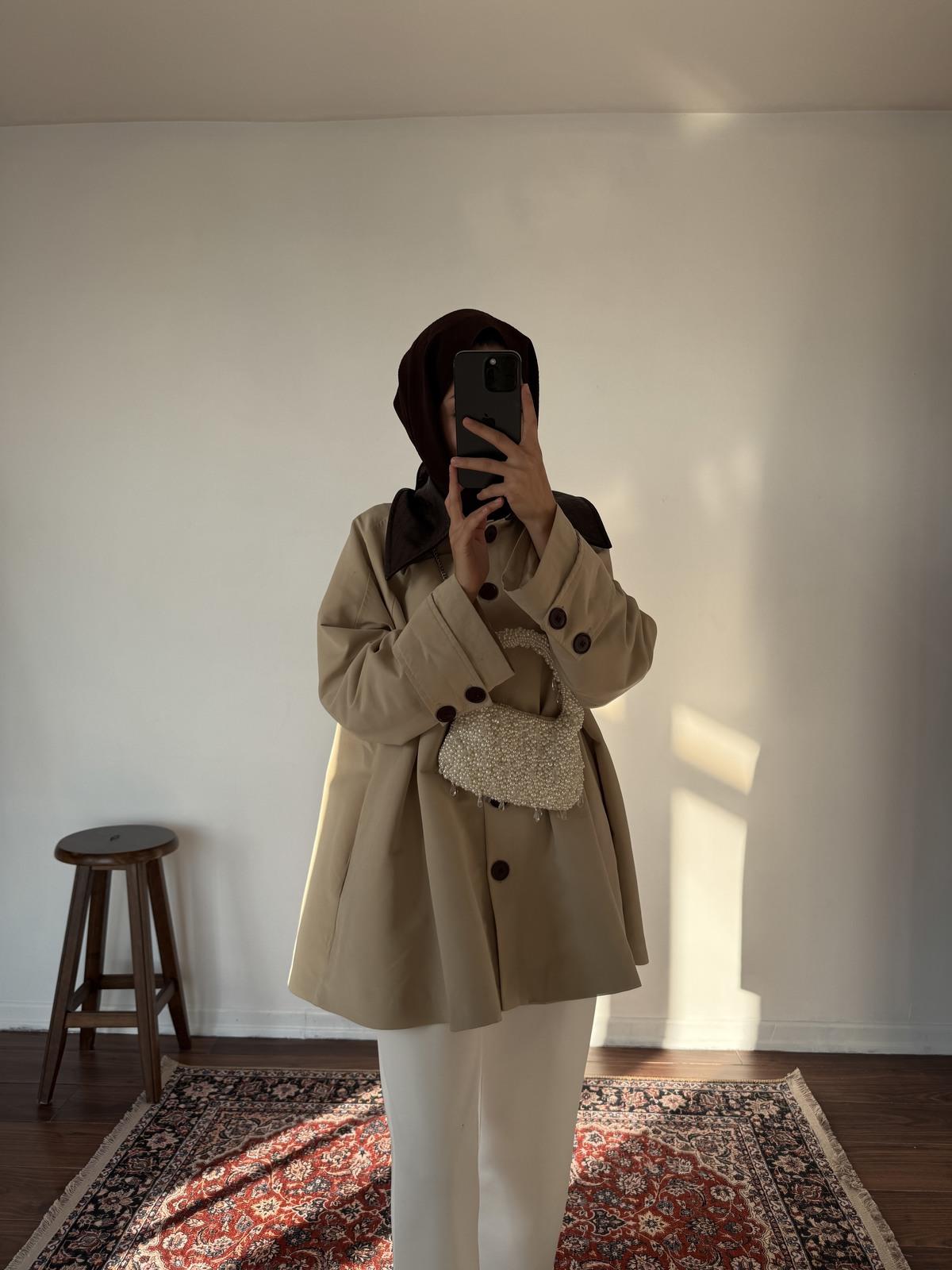 Yumuşak dokulu mevsimlik kumaşıyla hem ilkbahar hem sonbahar günlerinde ideal bir kullanım sağlar. Kuşak detayı vücut formunu zarifçe vurgularken, oversize kesim ise özgür bir şıklık yaratır.
