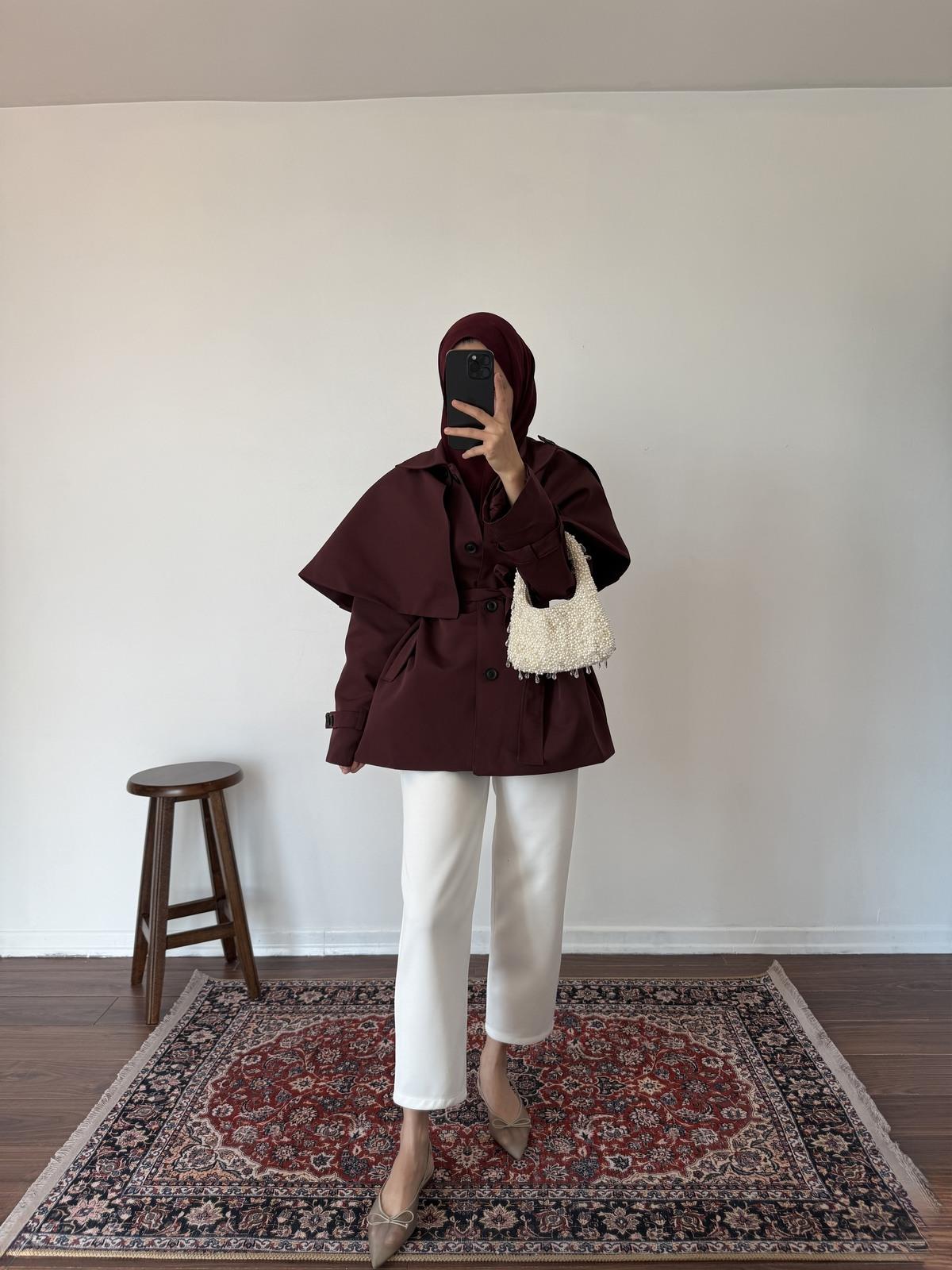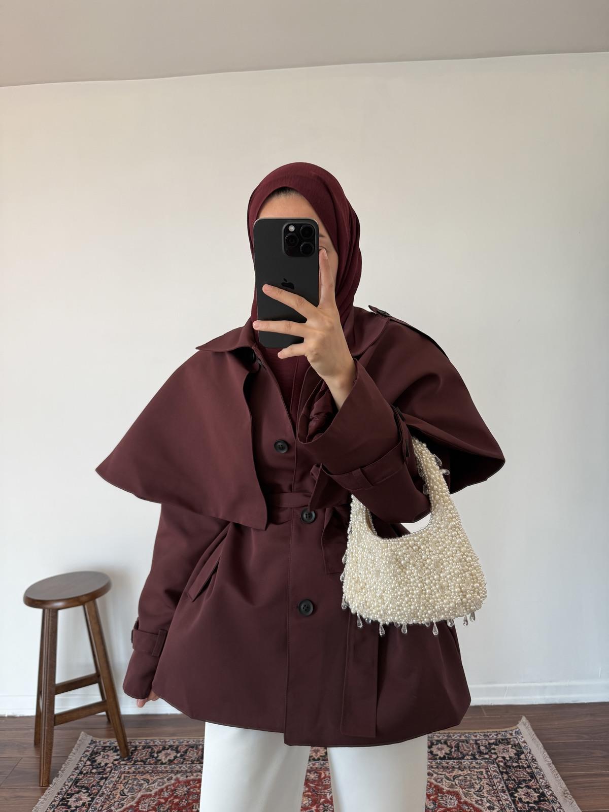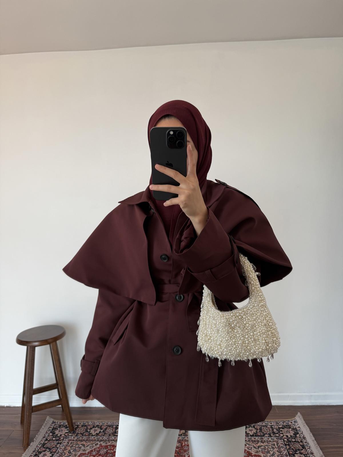 Pelerinli Premium Trençkot - Bordo (M202501)