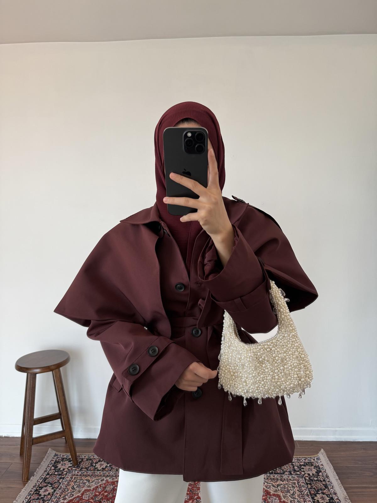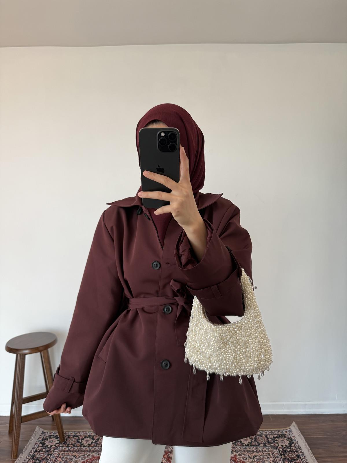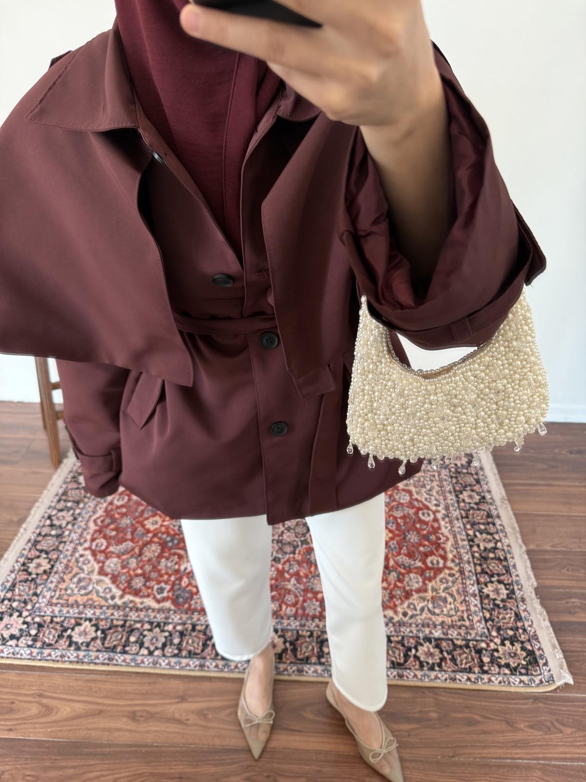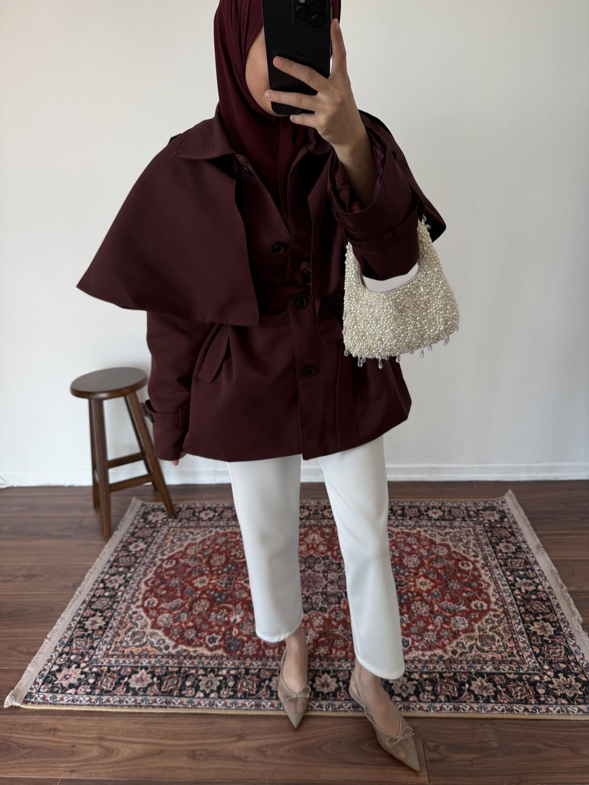 Pelerinli Premium Trençkot - Bordo (M202501)