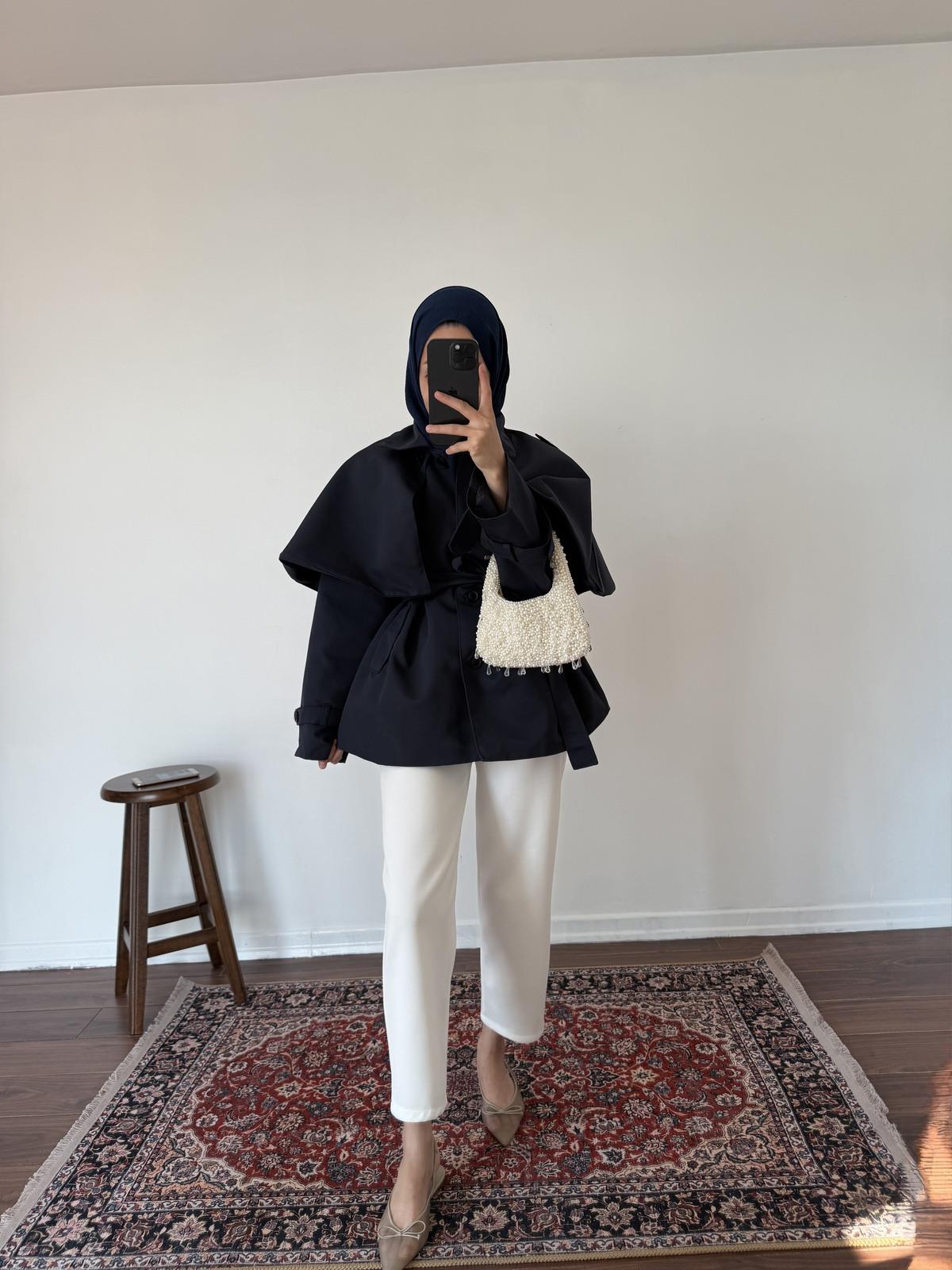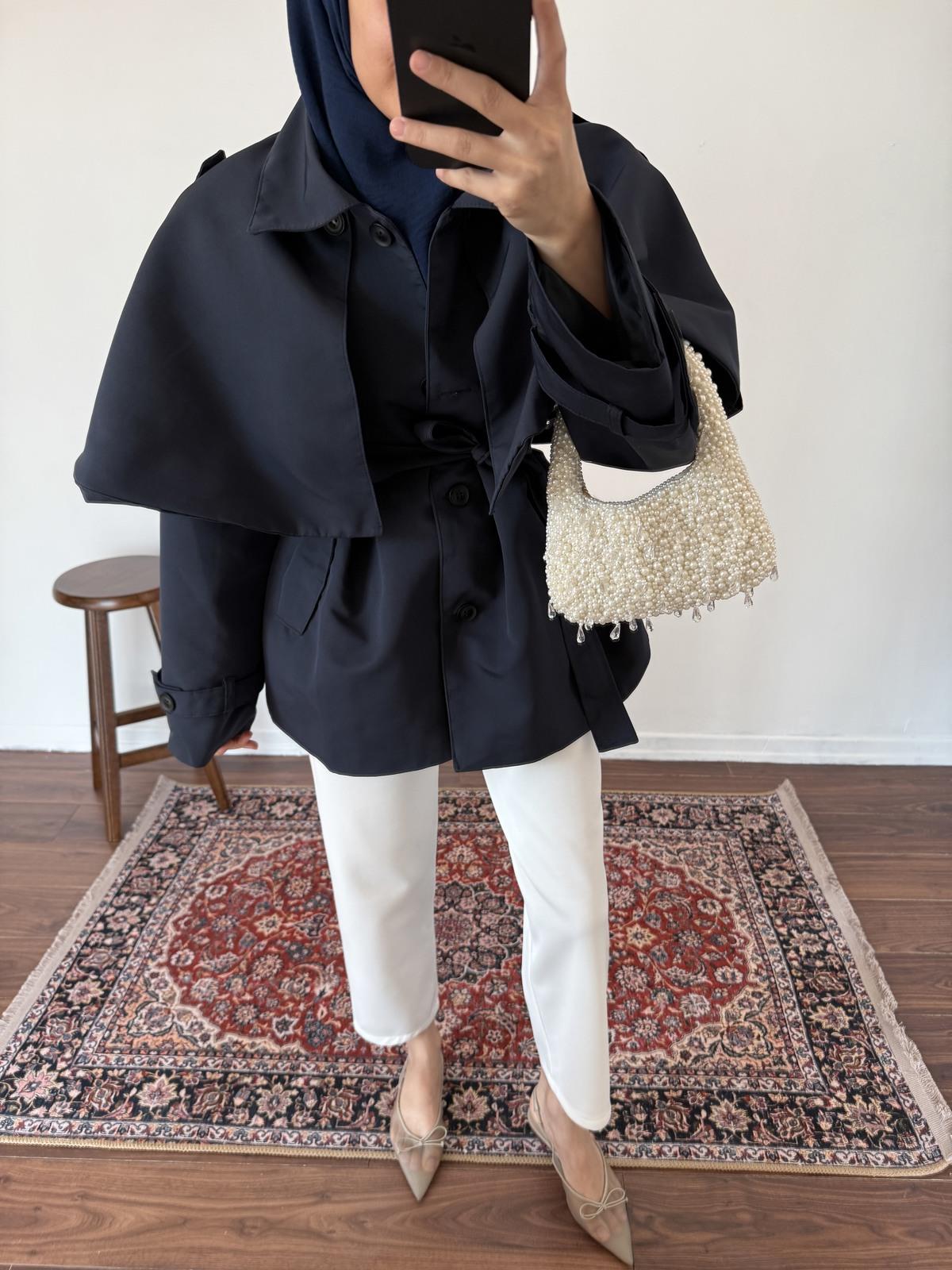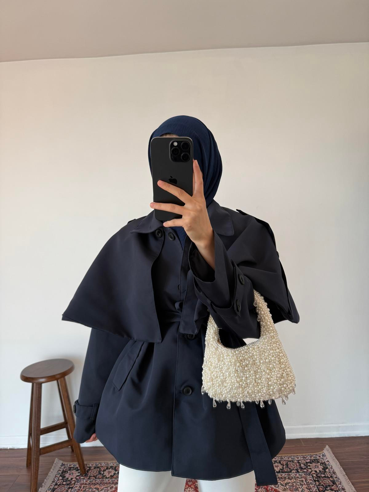 Pelerinli Premium Trençkot - Lacivert (M202501)