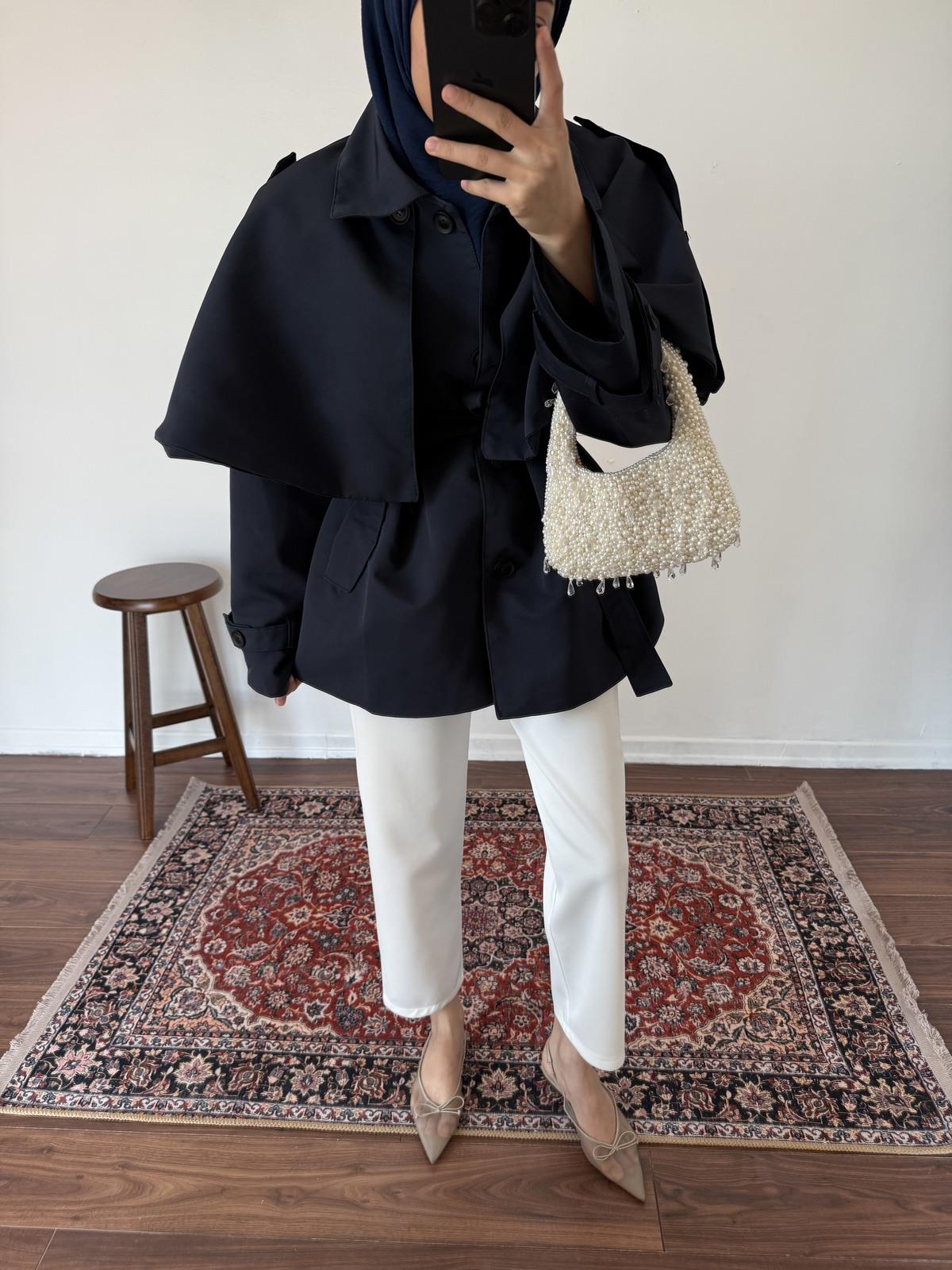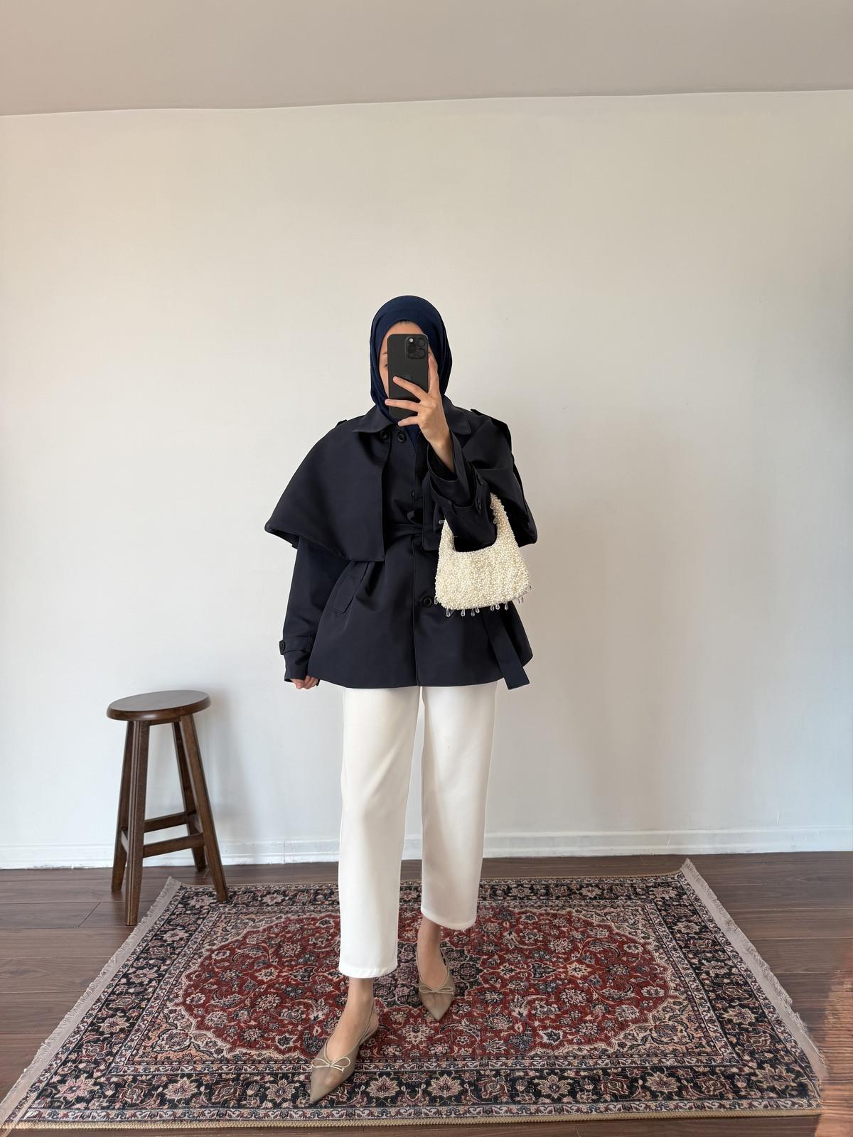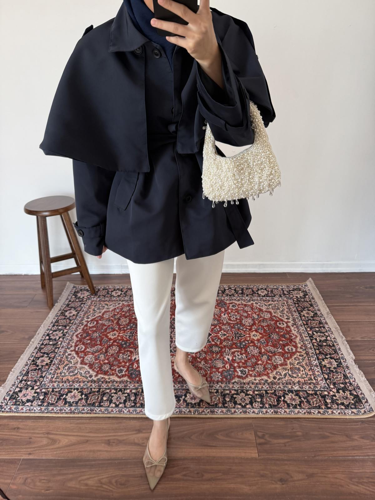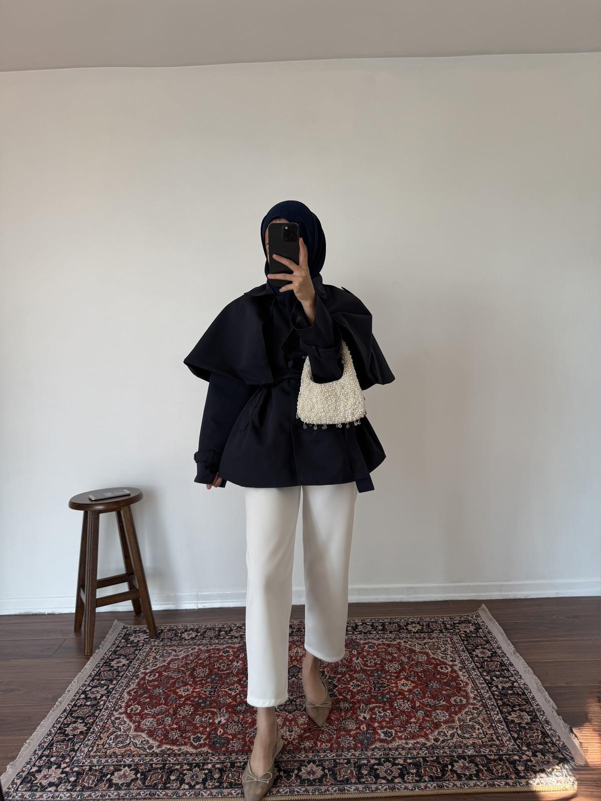 Pelerinli Premium Trençkot - Lacivert (M202501)