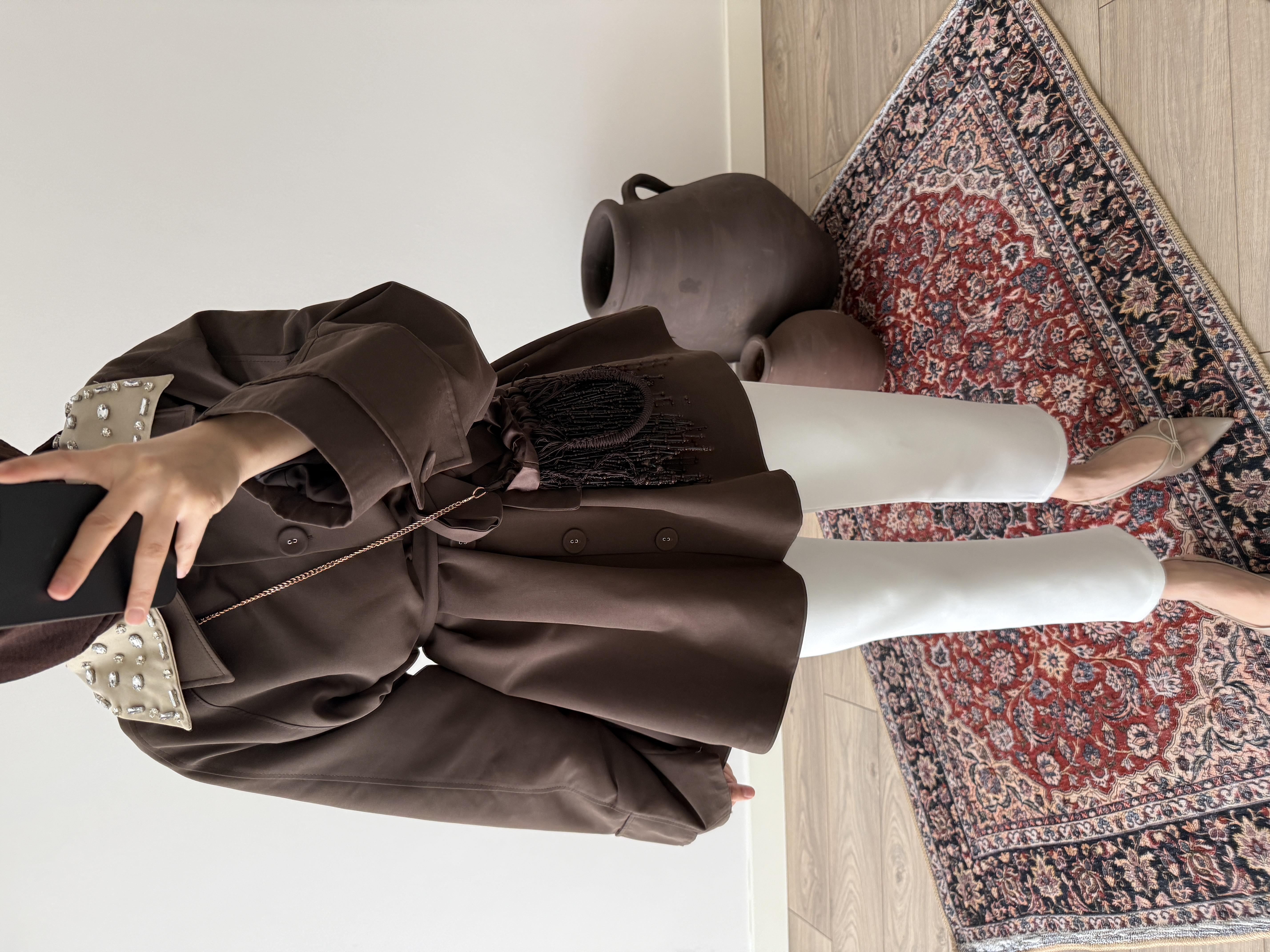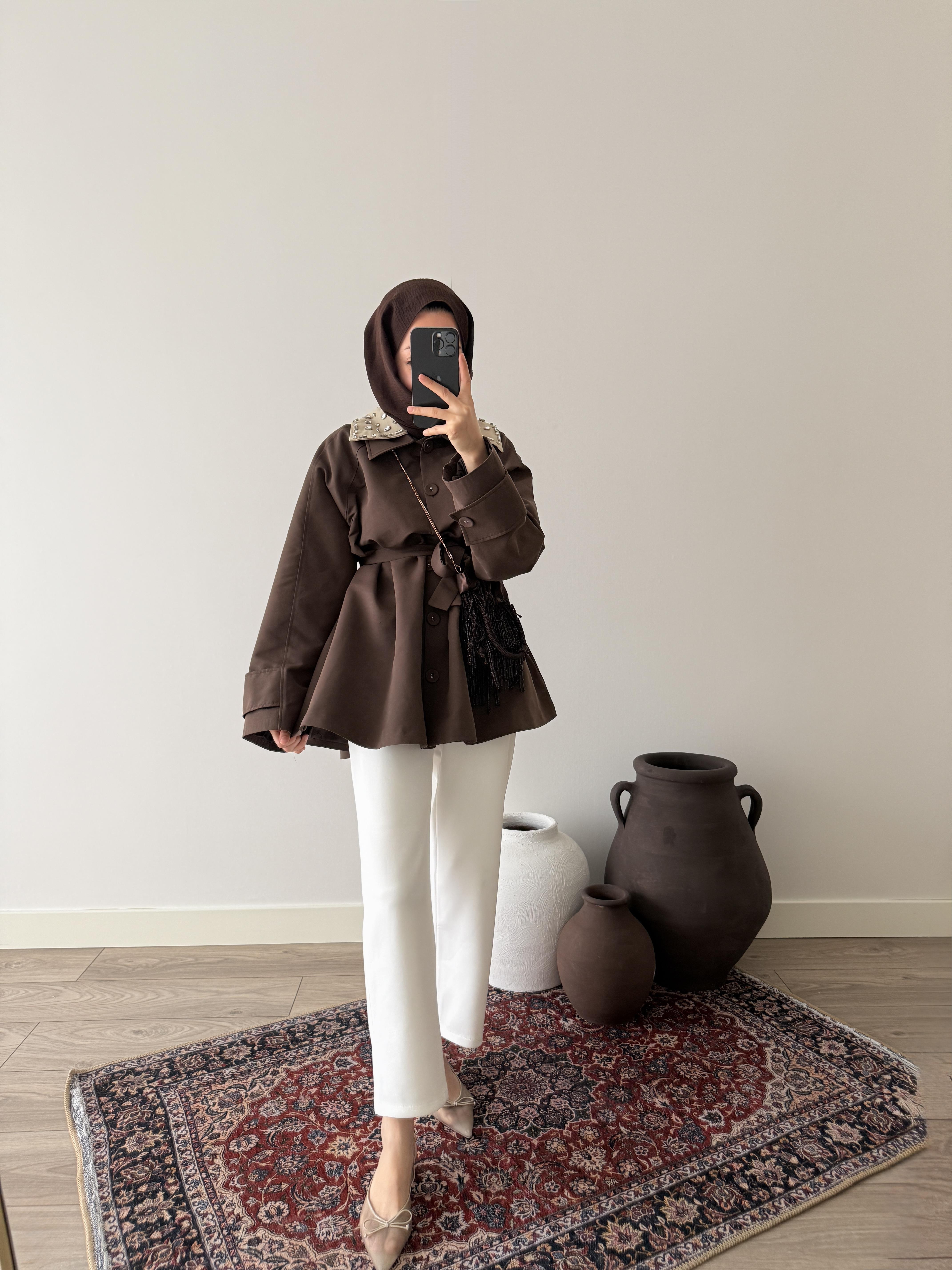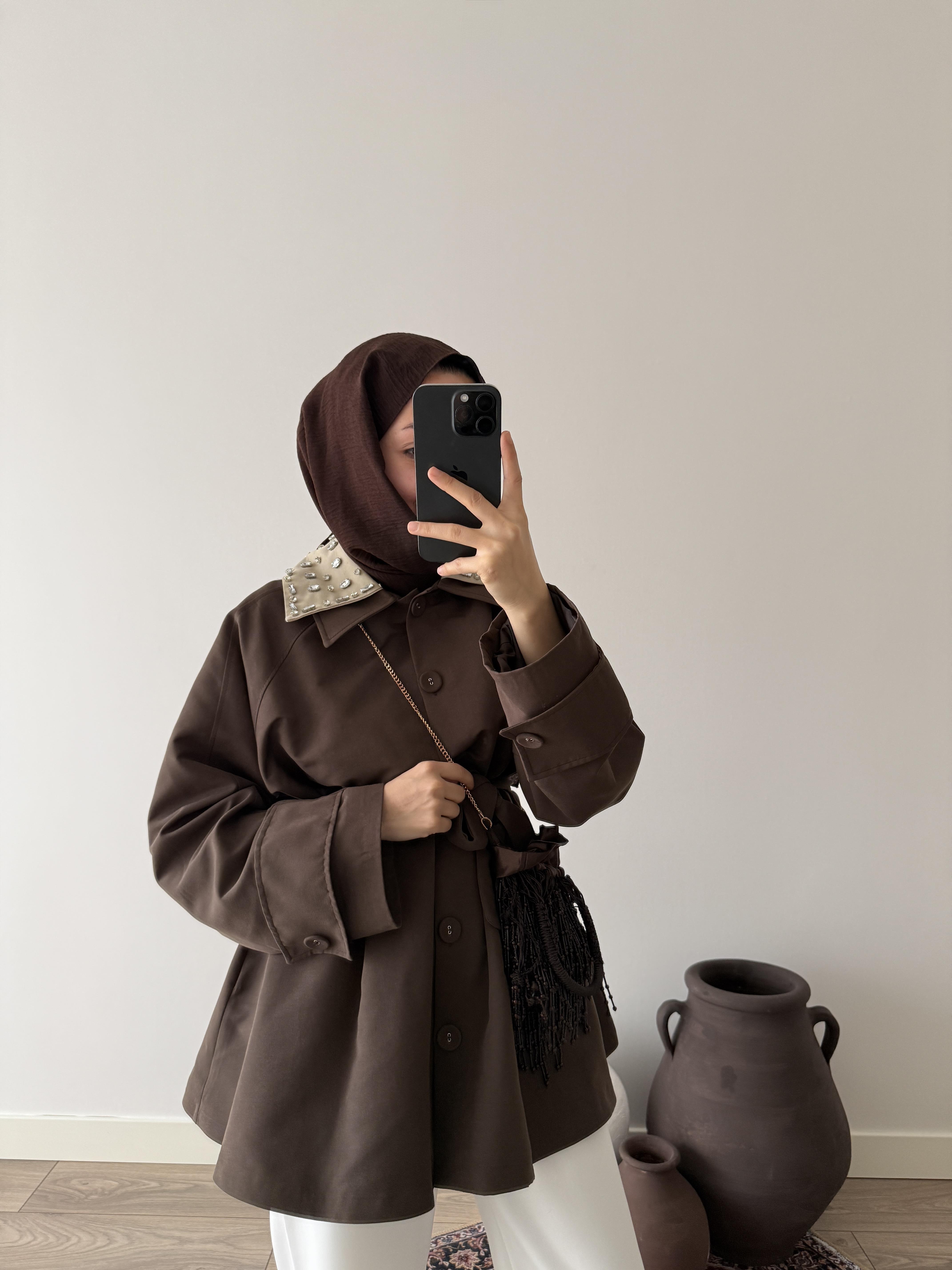 Taşlı Trençkot - Kahve