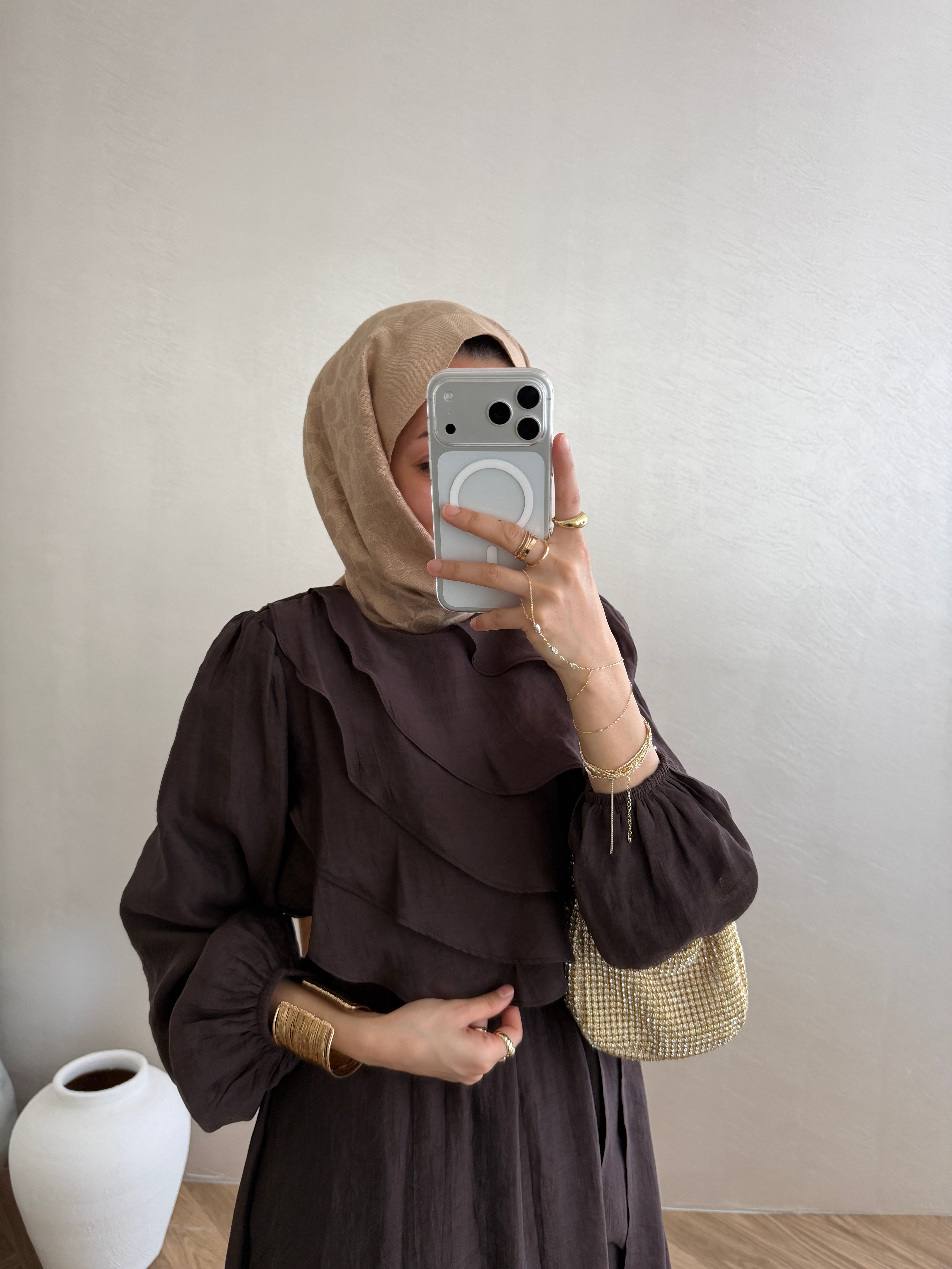 Vual kumaşın efil efil dokusu, volanlı İlham Detayının zarif dokunuşuyla buluşuyor.
