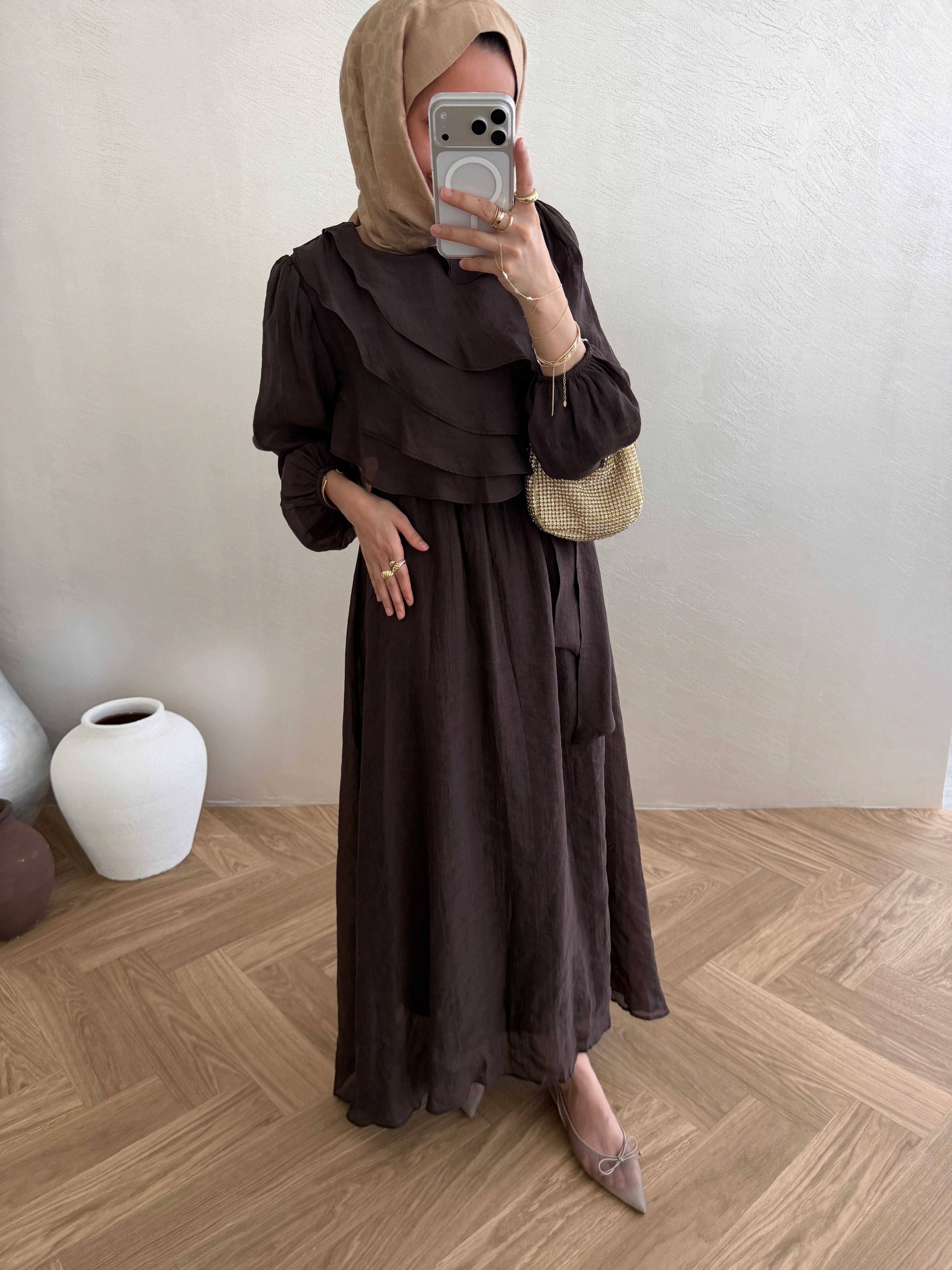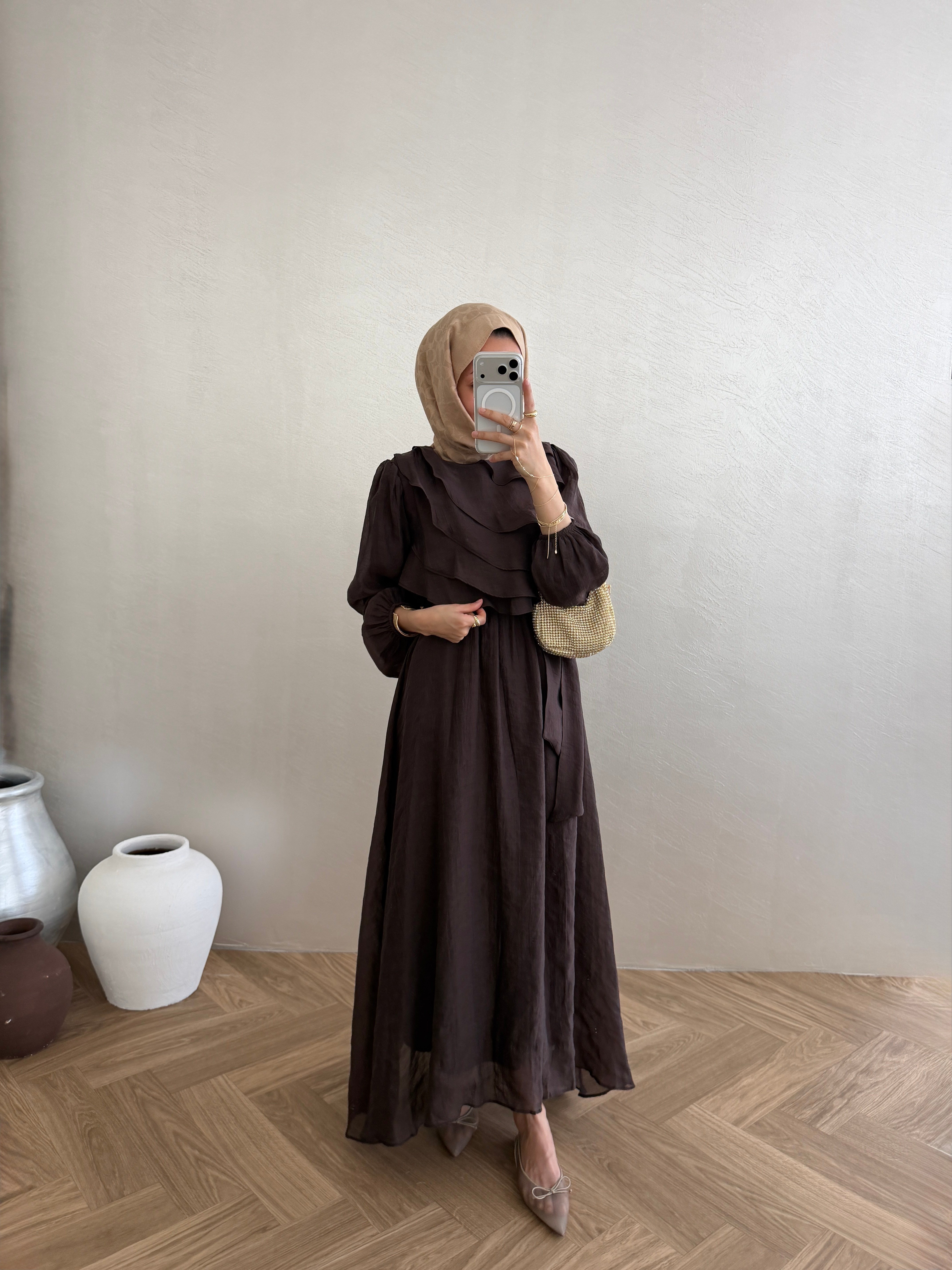 Volanlı Tensel Elbise - Kahve