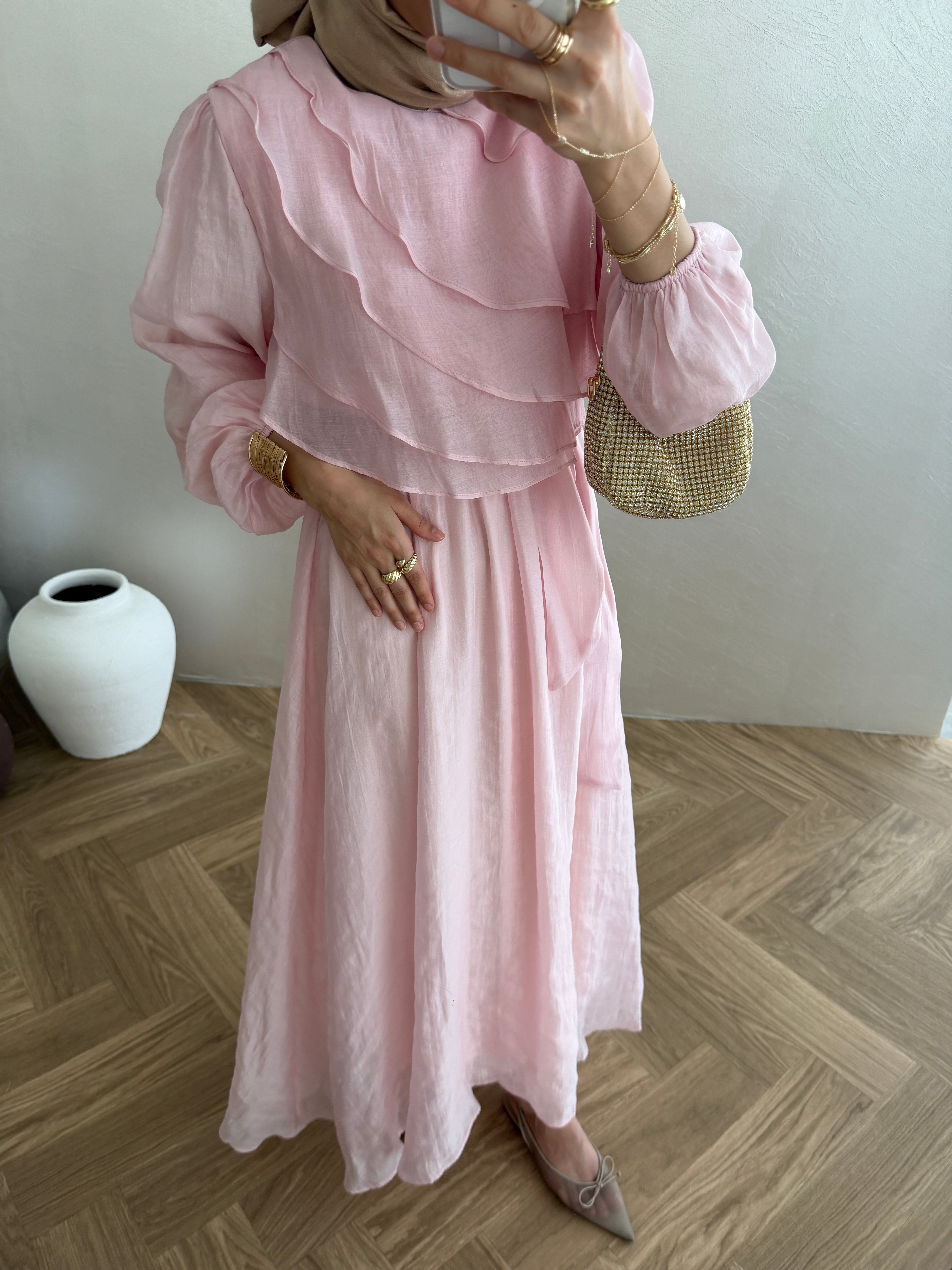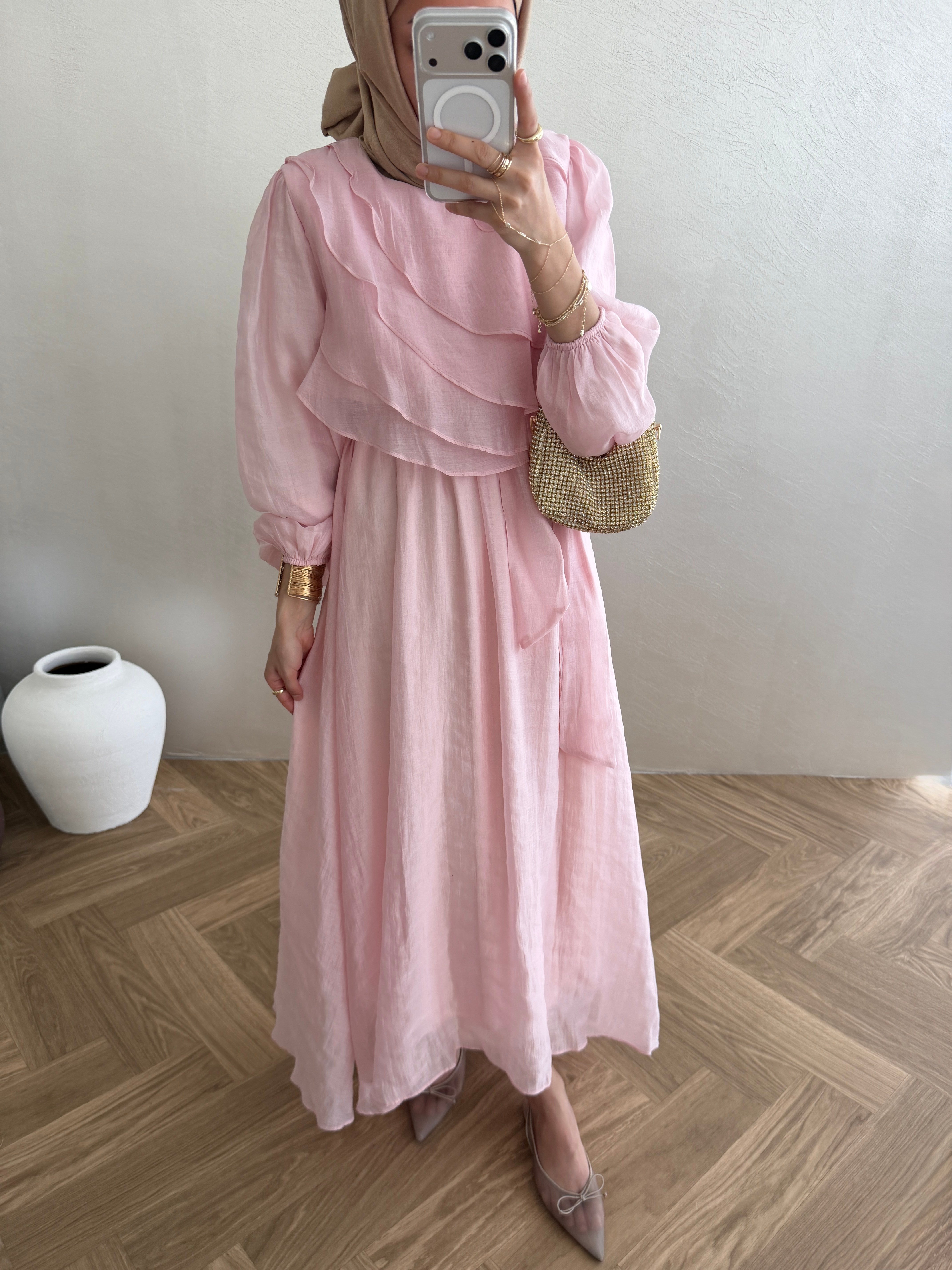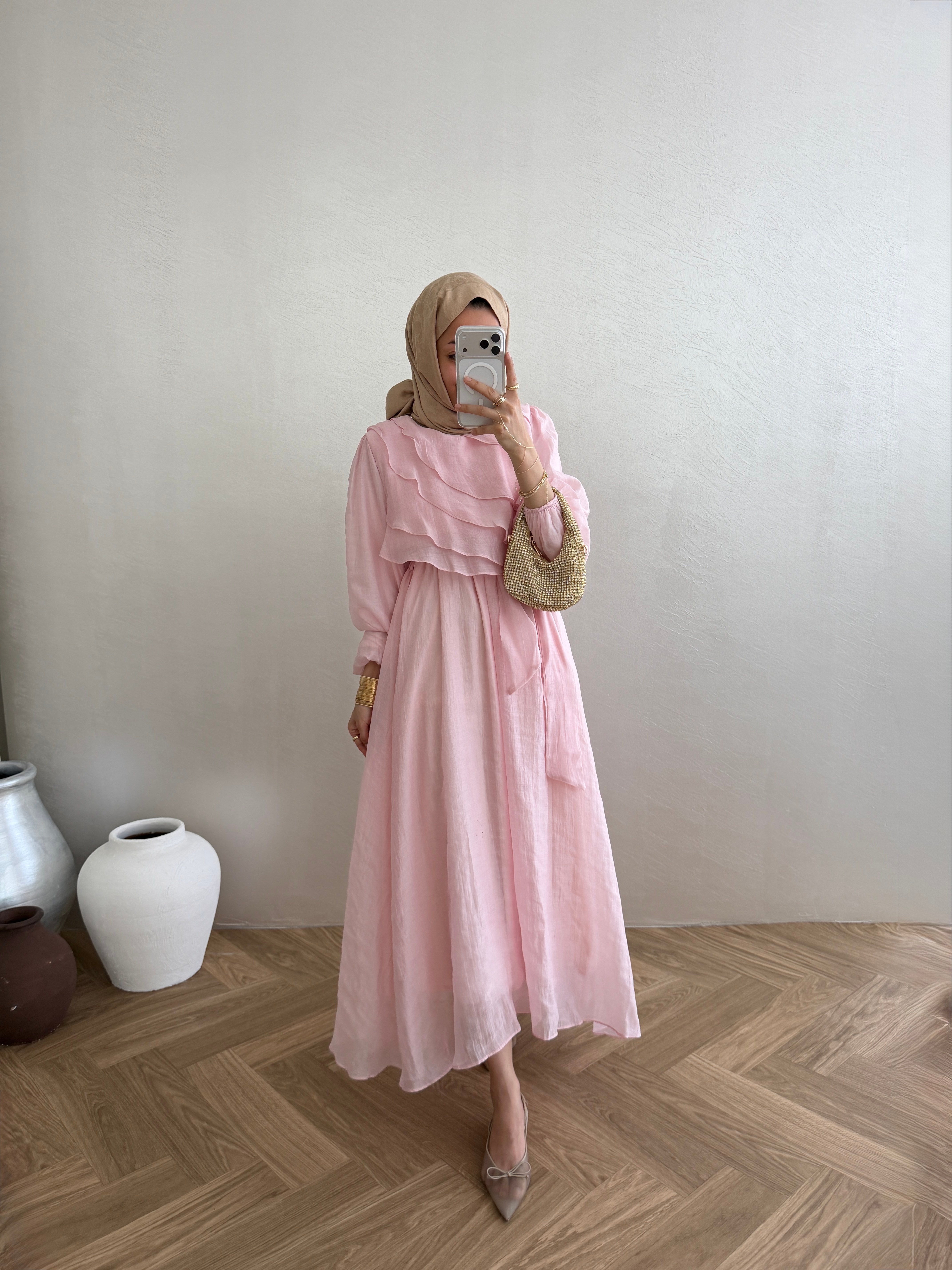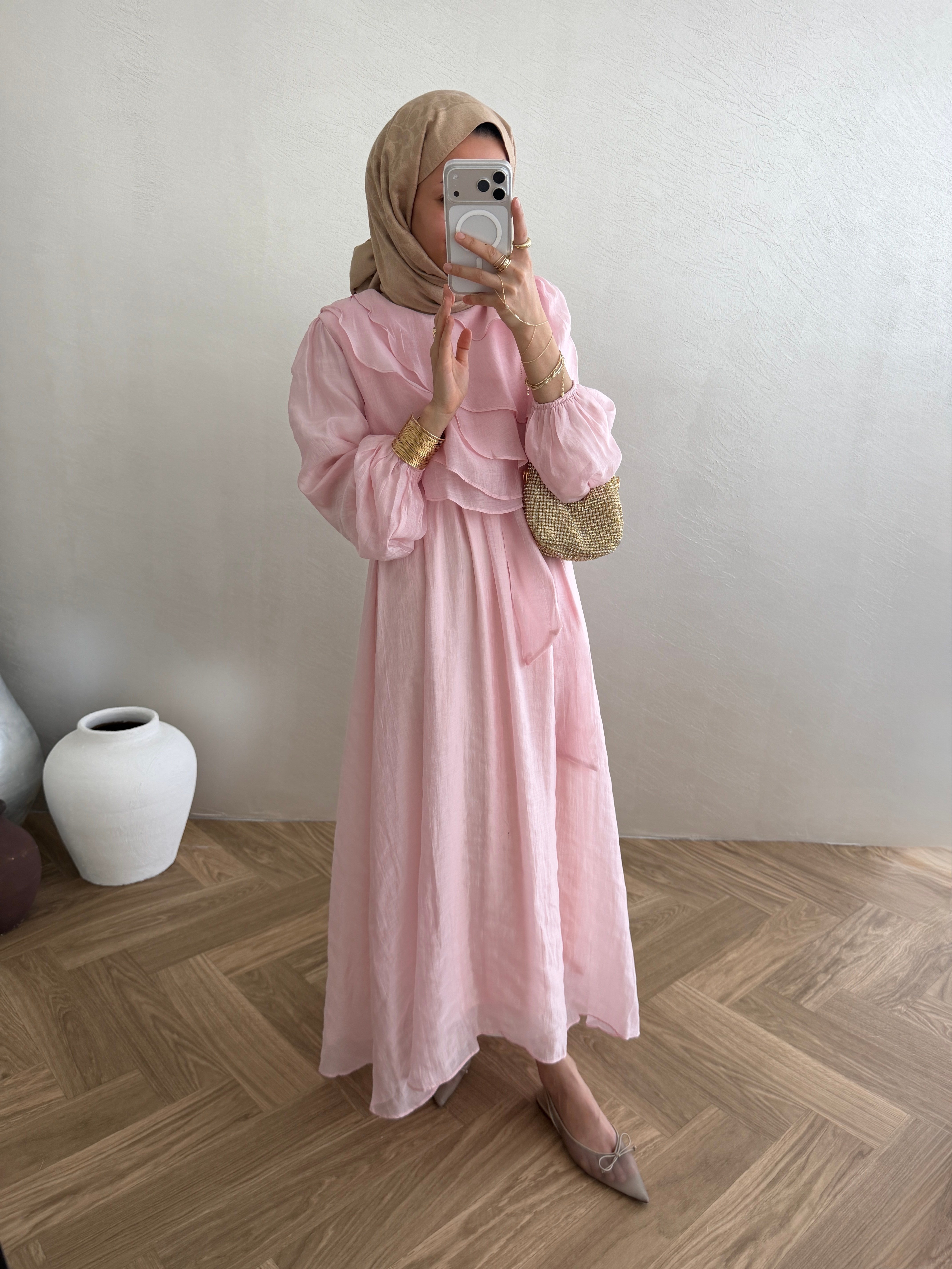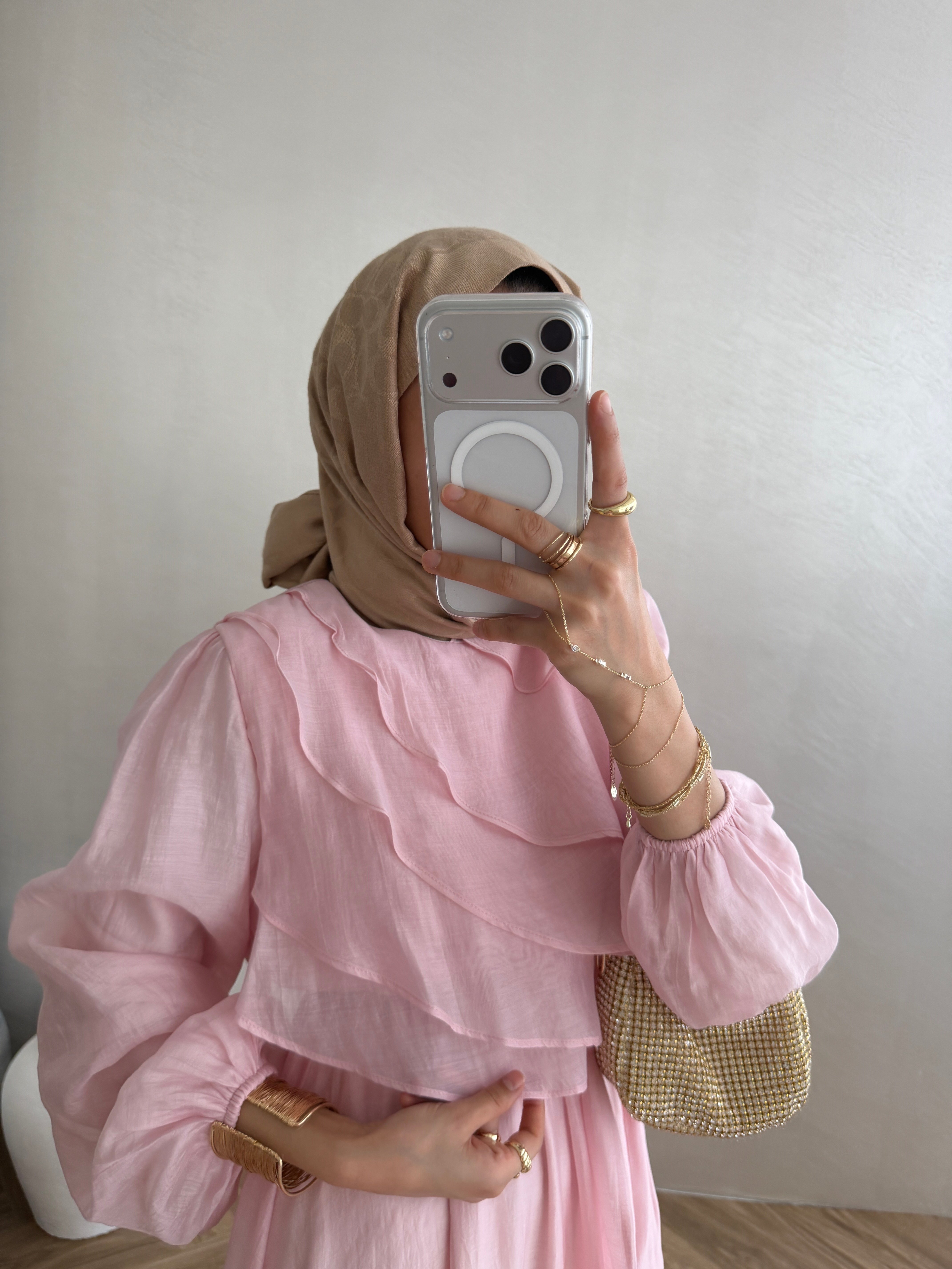 Vual kumaşın efil efil dokusu, volanlı İlham Detayının zarif dokunuşuyla buluşuyor.